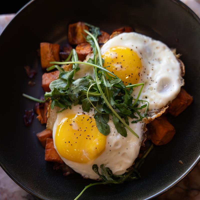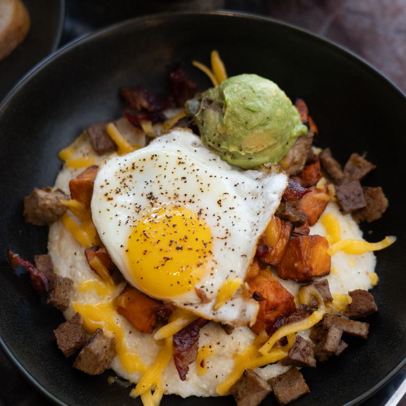 eggs, sweet potato, cheese grits, beef bacon, chicken sausage, cheddar, avocado