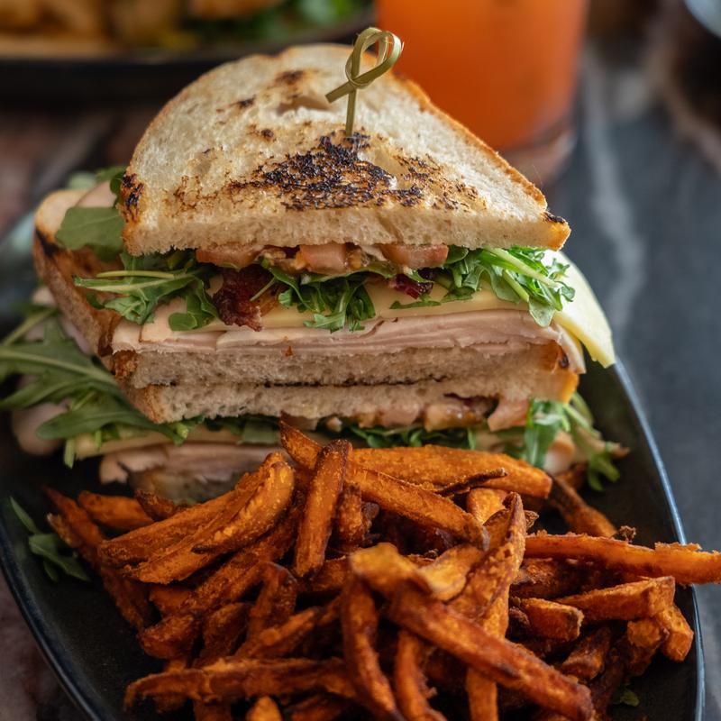 no nitrates or nitrites applewood smoked deli turkey, Havarti, arugula, tomato, beef bacon. served with a side of sweet potato fries or straight-cut fries.