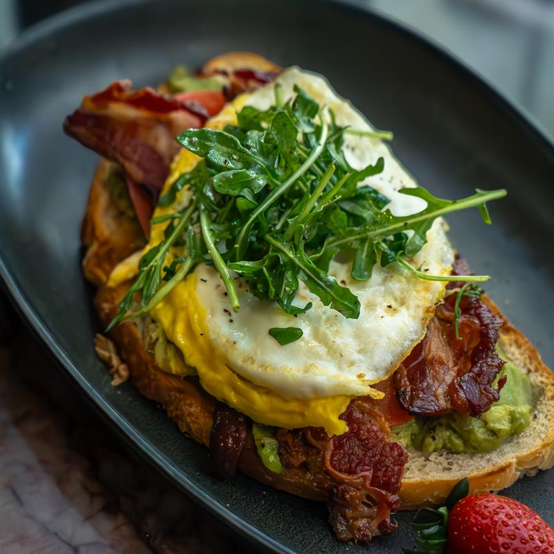 sourdough bread, fried egg, tomato, 2 beef bacon slices, arugula