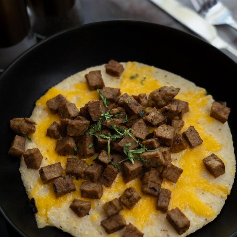 sourdough bread, bagel, biscuit, or tomato basil wrap, scrambled egg, cheddar cheese. Add 2 slices beef bacon or chicken sausage +3